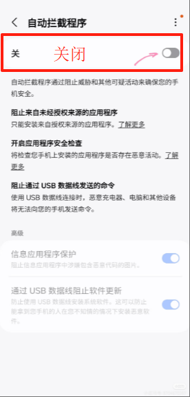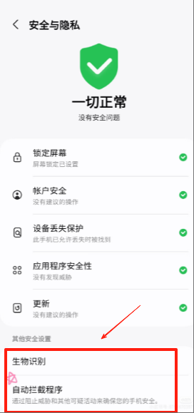第一步:手机设置→安全与隐私→生物识别和安全→打开允许“安装未知应用”→“自动拦截程序”关闭。